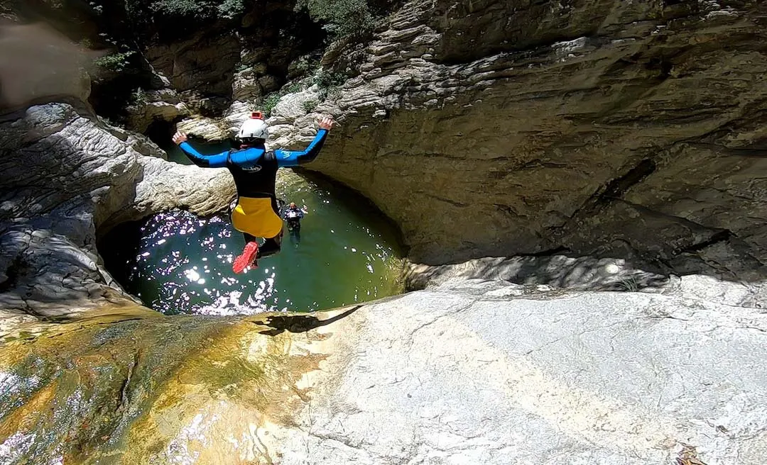 Dopo una breve camminata di 5 minuti raggiungerete l’inizio della forra, sotto il castello di Prodo, e inizierete subito con un tuffo e la discesa della cascata più alta, di 16 metri.