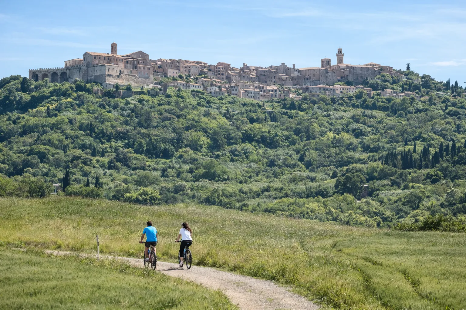 Anello facile di circa 31 km tra strade bianche in buone condizioni, vigneti e colline della Val d’Orcia. Tra le tappe principali: Chiesa di San Biagio, punto panoramico con vista sul Monte Amiata e discesa tra cipressi verso Monticchiello.