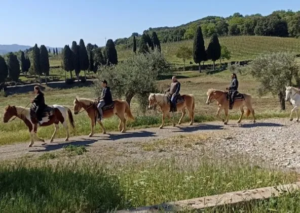 Accompagnati da una guida esperta, partirete dal ranch per una passeggiata a cavallo tra vigneti e uliveti, attraversando il paesaggio tipico delle colline toscane. Lungo il percorso raggiungerete una rinomata cantina vitivinicola del territorio, dove è prevista una sosta dedicata alla degustazione di diversi vini locali di alta qualità, accompagnata da un light lunch in cantina.